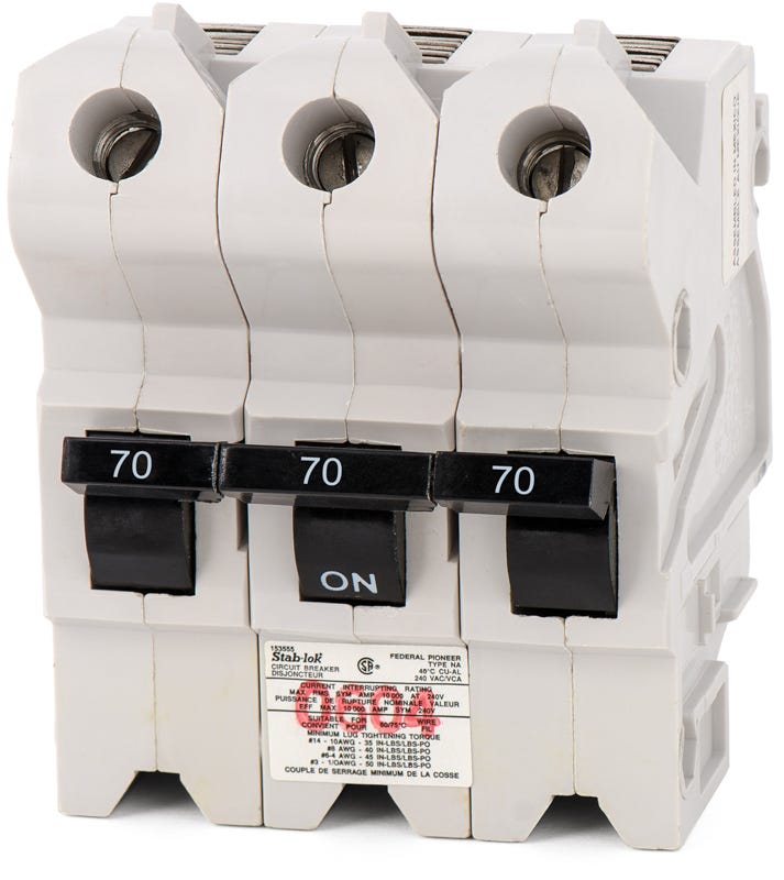 The Federal Pacific NA3P70 is a 3 Pole thermal magnetic molded case circuit breaker with a current rating of 70 Amps and a voltage rating of 240VAC. It has an interrupting rating of 10kAIC at 240V. The NA3P70 has a plug-in connection type and includes LI - long-time and instantaneous trip function.