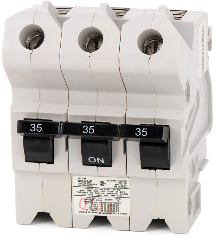 • Authentic Federal Pacific Product • Federal Pacific Electric American Circuit Breaker (FPE) • Nb • 3 Pole • 35 Ampere Rating • Size 3" Wide