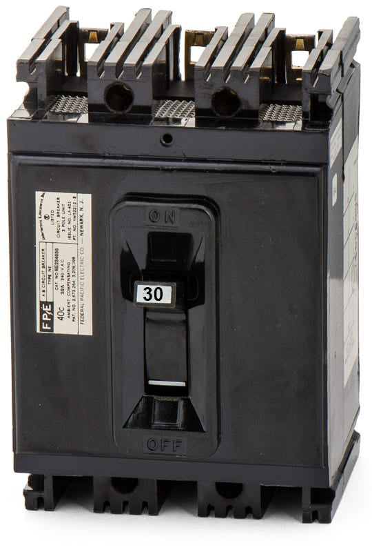 The Federal Pacific NE234030 is a 3 Pole thermal magnetic molded case circuit breaker with a current rating of 30 Amps and a voltage rating of 240VAC. It has an interrupting rating of 18kAIC at 240V. The NE234030 has a bolt-on connection type and includes long time and instantaneous trip functions.