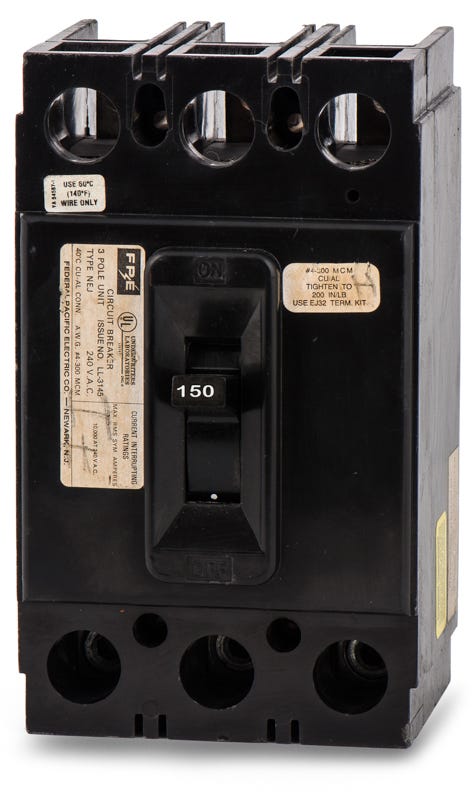 Federal Pacific NEJ type three pole 150 ampere bolt-on molded case circuit breaker with maximum voltage rating of 240V trip type fixed thermal magnetic and high interrupting rating of 14 kiloampere at 240V functions long-time and instantaneous complete with load side lug terminals.