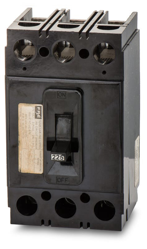 The Federal Pacific NEJ233225 is a 3 Pole thermal magnetic molded case circuit breaker with a current rating of 225 Amps and a voltage rating of 240VAC. It has an interrupting rating of 10kAIC at 240V. The NEJ233225 has a bolt-on connection type and includes long time and instantaneous trip functions.