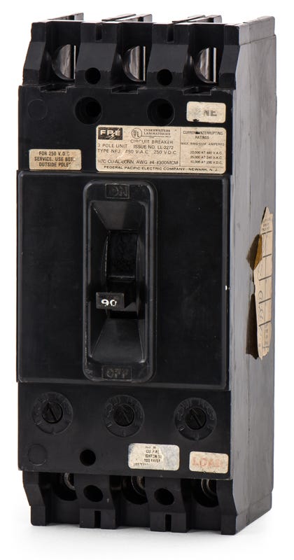 Federal Pacific NFJ series three pole 90 ampere bolt-on molded case circuit breaker with maximum voltage rating of 600V trip type thermal magnetic functions long-time and instantaneous complete with load side lug terminals.