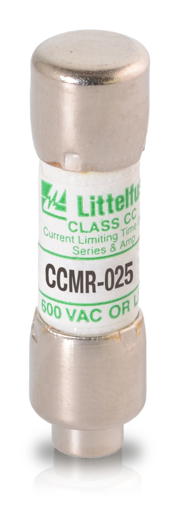 The Littelfuse CCMR-025 is a fuse with a current rating of 25 Amps and a voltage rating of 600VAC, 500VDC. It has an interrupting rating of 200kAIC at 600VAC. The CCMR-025 has a ferrule terminal connection type.