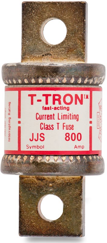 Cooper / Bussmann class T 800 ampere T-Tron very fast acting characteristics standard current limiting electronic fuse with maximum voltage rating of 600V and high interrupting rating of 200 kiloampere at 600V for protection of control or solenoid circuit terminal type blade.