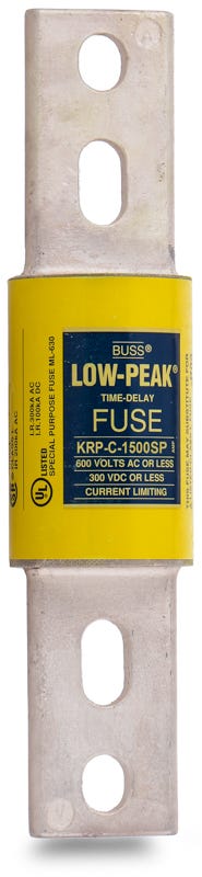 The Eaton KRP-C-1500SP is a fuse with a current rating of 1500 Amps and a voltage rating of 600VAC, 300VDC. It has an interrupting rating of 300kAIC at 600VAC. The KRP-C-1500SP has a blade connection type and comes with Melamine Tube material.
