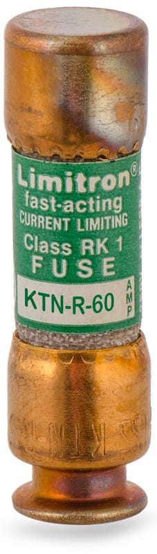 Cooper / Bussmann KTN-R series 60 ampere class Rk1 rejection fast acting characteristics power fuse with maximum voltage rating of 250V and high interrupting rating of 20 kiloampere at 250Vac used on fast acting fuses to protect control circuit transformers and current limiting ferrule terminal fuses.