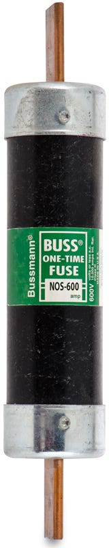 Cooper / Bussmann NOS series 600 ampere class H one time characteristics renewable & non-renewable fuse with maximum voltage rating of 600V and high interrupting rating of 10 kiloampere at 600Vac used on one time fuses to protect control circuit transformers and non current limiting fuses.