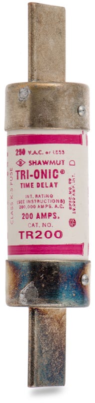 Ferraz Shawmut family Tri-Onic TR series 200 ampere high quality electronic fuse with maximum voltage rating of 250 volt and standard interrupting rating of 200 kiloampere at 250V.