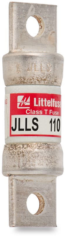 Littelfuse class T 110 ampere fast acting characteristics standard current limiting power fuse with maximum voltage rating of 600V and high interrupting rating of 200 kiloampere at 600V for protection of control or solenoid circuit terminal type blade.