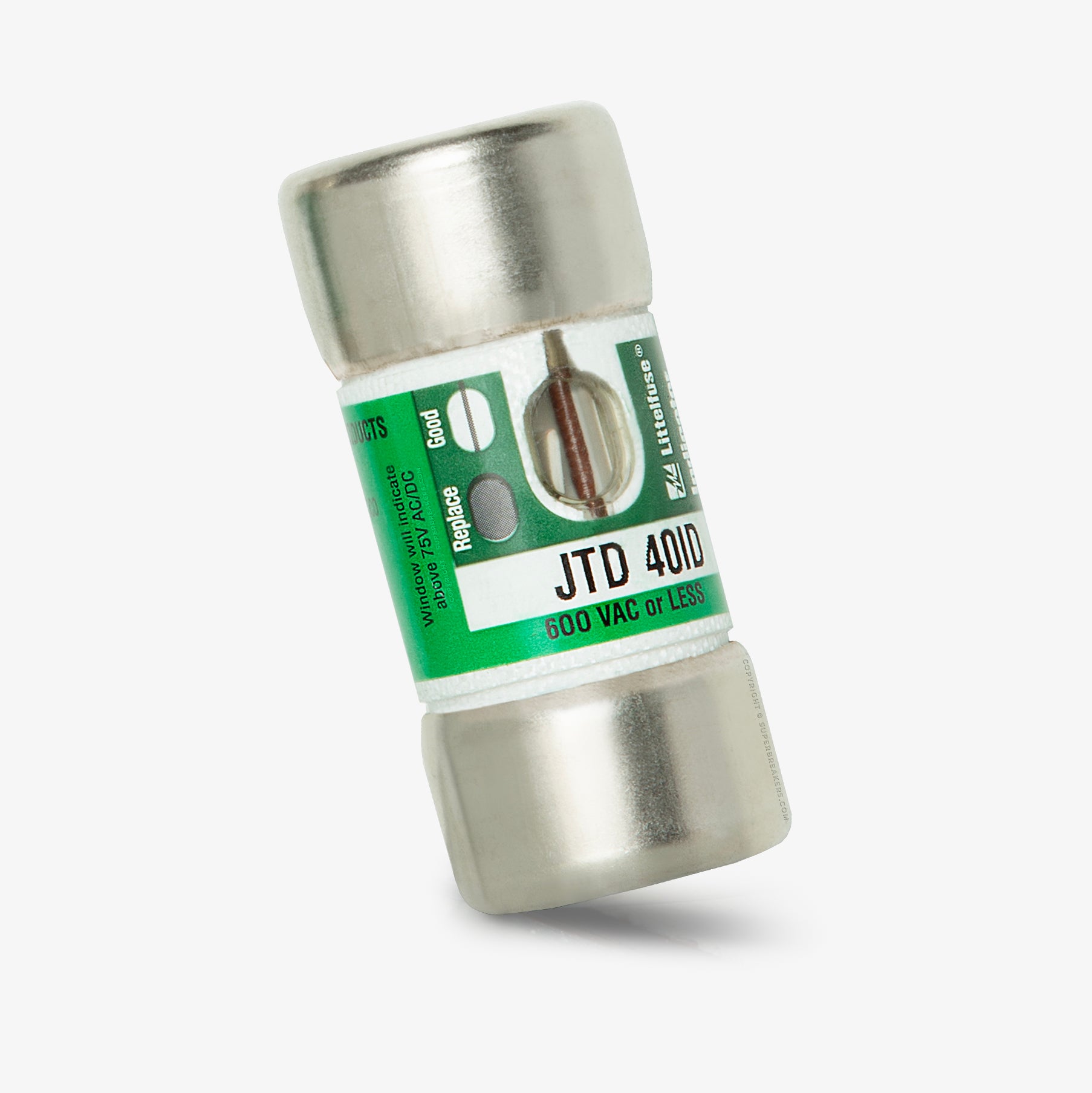 The Littelfuse JTD-40ID is a fuse with a current rating of 40 Amps and a voltage rating of 600VAC, 300VDC. It has an interrupting rating of 300kAIC at 600VAC, 20kAIC at 300VDC.