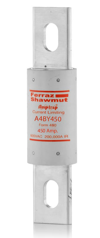 The Mersen A4BY450 is a fuse with a current rating of 450 Amps and a voltage rating of 600VAC, 300VDC. It has an interrupting rating of 100kA at 300VDC, 200kA at 600VAC. The A4BY450 has a bolted mounting type and it is used for mains, feeders, circuit breakers, load centers, panelboards, switchboards, metering center applications.