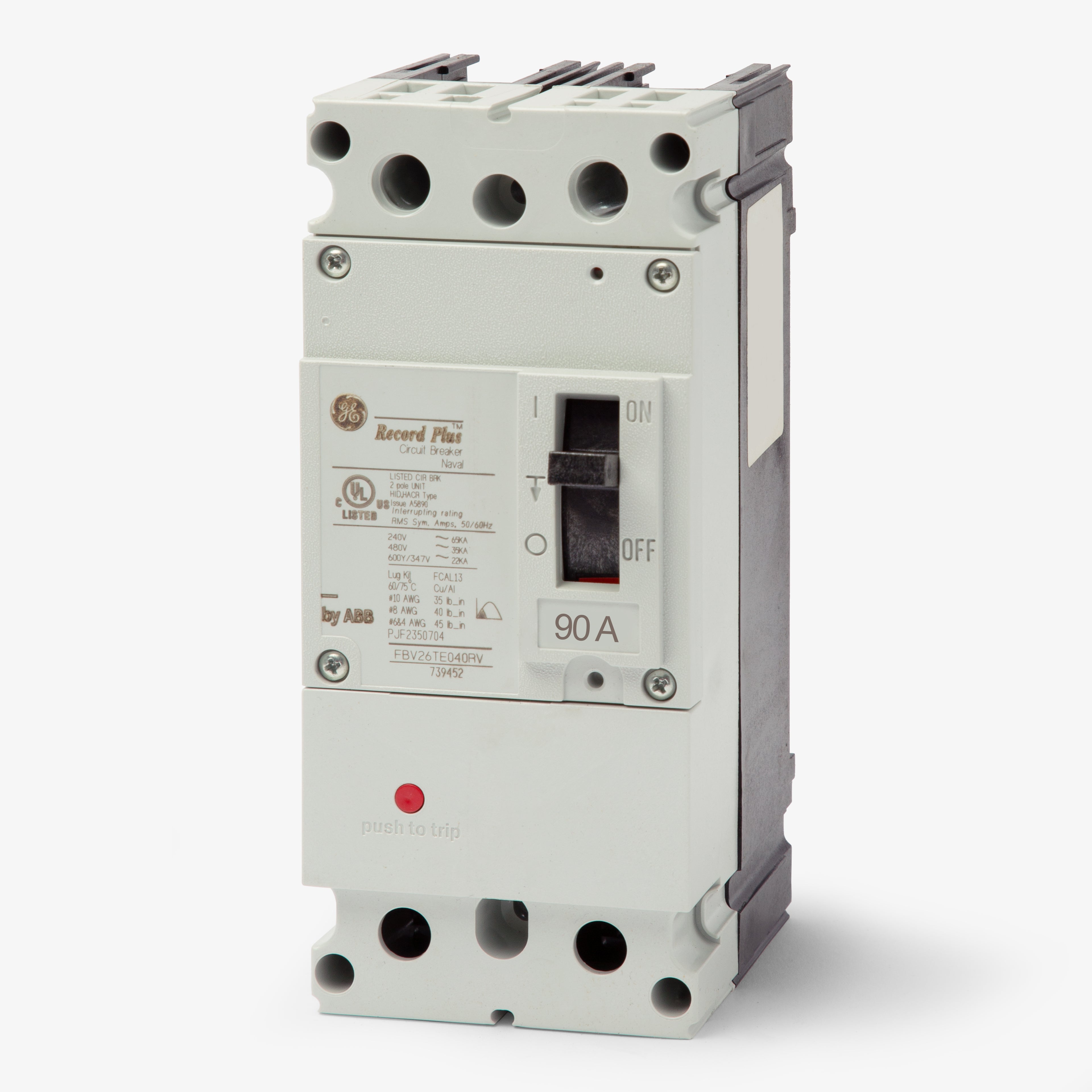 The General Electric FBV26TE090R2 is a 2 Pole thermal magnetic molded case circuit breaker with a current rating of 90 Amps and a voltage rating of 600V. It has an interrupting rating of 150kAIC at 480V. The FBV26TE090R2 has a bolt-on connection type and includes long time and instantaneous trip functions.