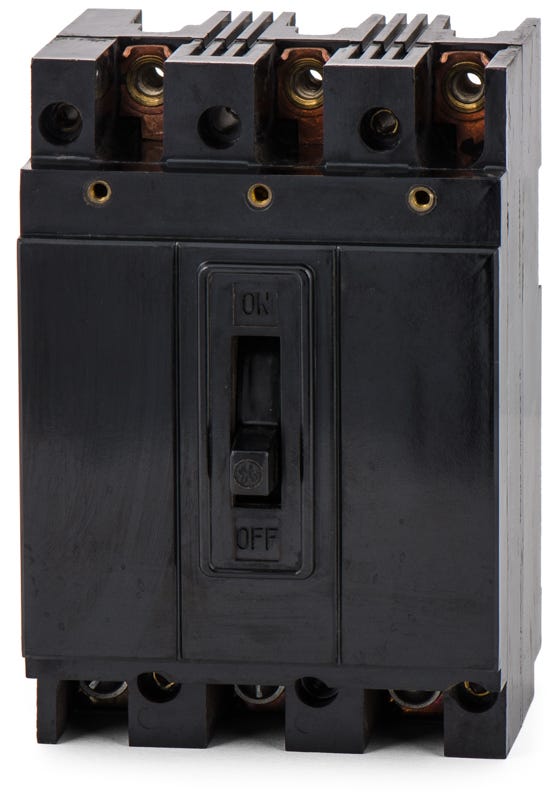 The General Electric TE32040 is a 3 Pole thermal magnetic molded case circuit breaker with a current rating of 40 Amps and a voltage rating of 240VAC. It has an interrupting rating of 10kAIC at 240V. The TE32040 has a bolt-on connection type and includes long time and instantaneous trip functions.