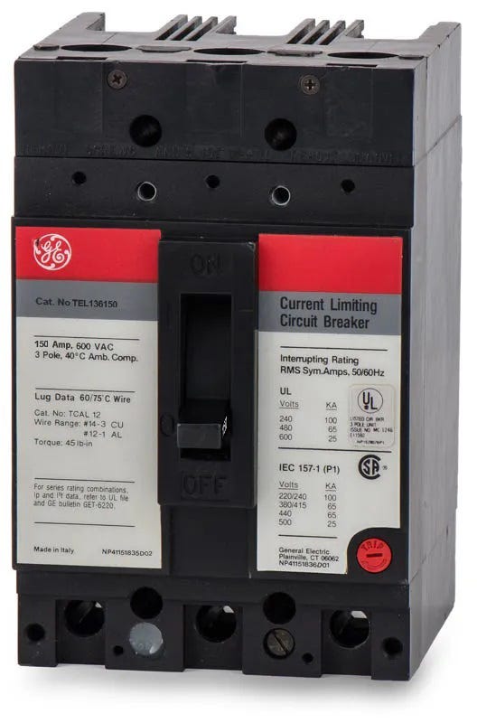 The General Electric TEL136150 is a 3 Pole thermal magnetic molded case circuit breaker with a current rating of 150 Amps and a voltage rating of 600V. It has an interrupting rating of 65kA@480V. The TEL136150 has a bolt-on connection type and includes LI - long time and instantaneous functions.