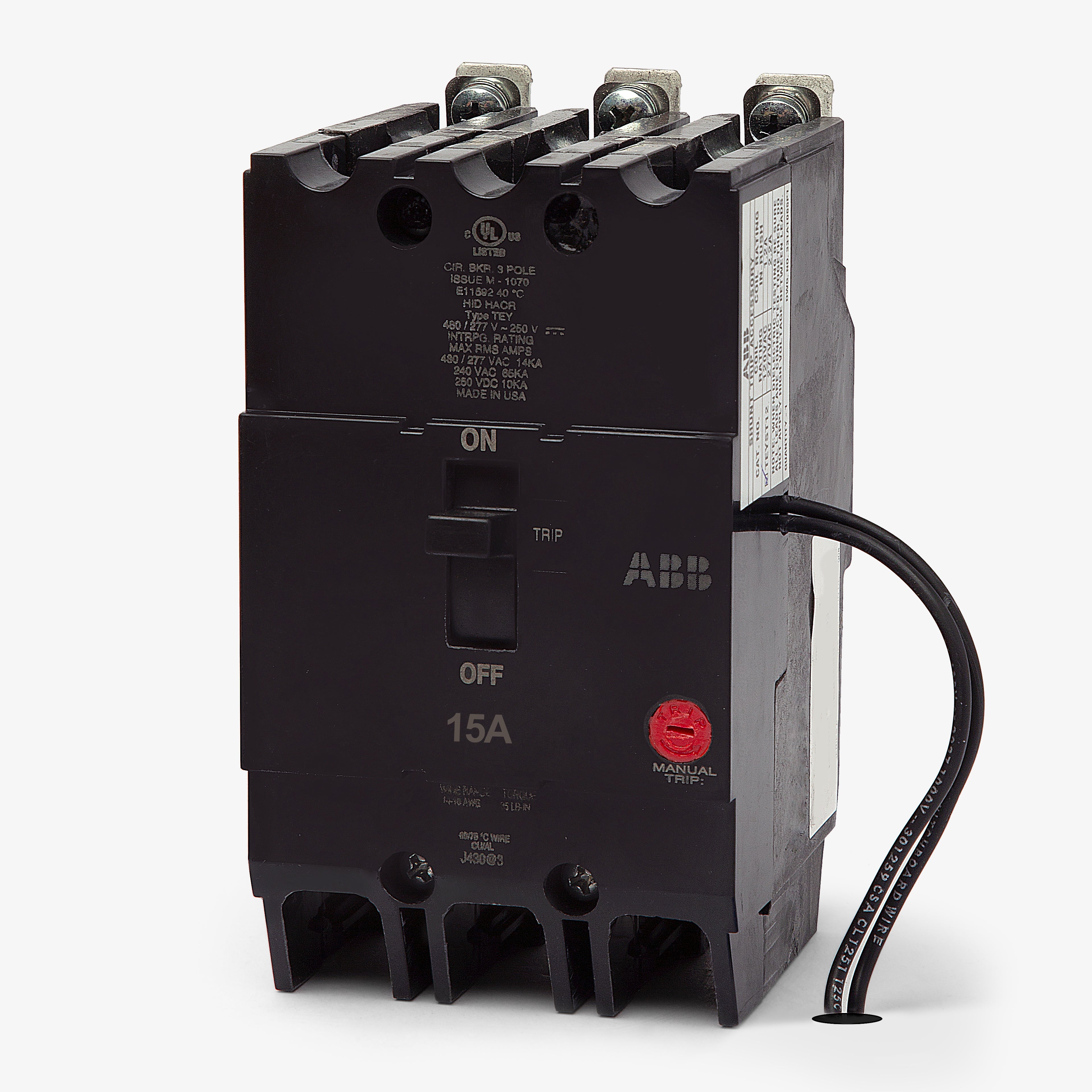 The General Electric TEY315ST12 is a 3 Pole thermal magnetic molded case circuit breaker with a current rating of 15 Amps and a voltage rating of 277/480VAC. It has an interrupting rating of 14kAIC at 480V. The TEY315ST12 has a bolt-on connection type and includes LI - long-time and instantaneous trip function.