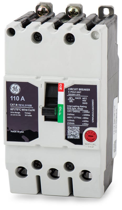The General Electric TEYL3110B is a 3 Pole thermal magnetic molded case circuit breaker with a current rating of 110 Amps and a voltage rating of 277/480VAC, 250VDC. It has an interrupting rating of 65kA at 277/480VAC. The TEYL3110B has a bolt-on connection type and includes long time and instantaneous trip functions.
