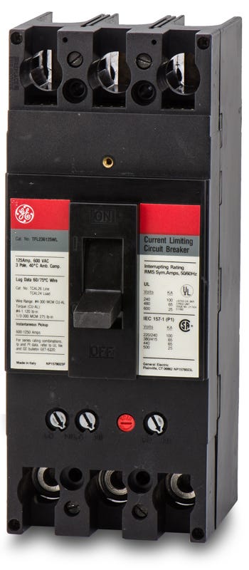 General Electric TFL series three pole 125 ampere bolt-on molded case circuit breaker with maximum voltage rating of 600V trip type fixed thermal magnetic and standard interrupting of 65 kiloampere at 480V complete with non-interchangeable trip (LI) long-time and instantaneous trip functions and load side lug terminals.