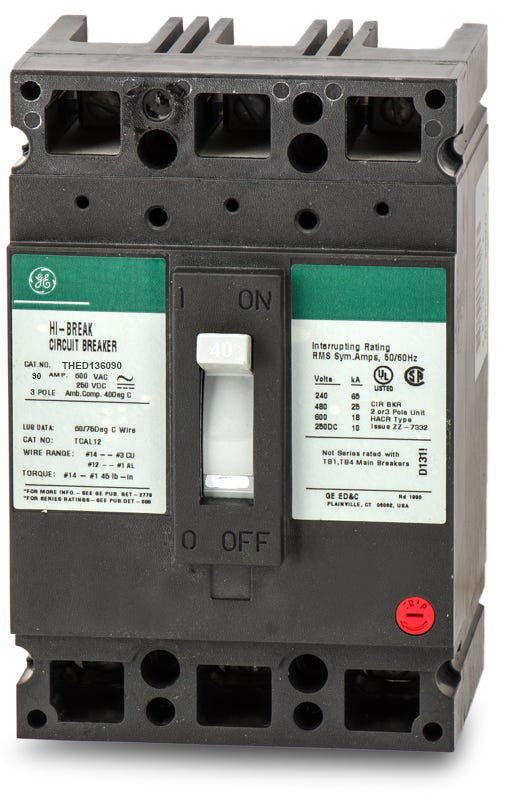The General Electric THED136090 is a 3 Pole thermal magnetic molded case circuit breaker with a current rating of 90 Amps and a voltage rating of 120/240/277/480/600VAC, 125/250VDC. It has an interrupting rating of 25kAIC at 277/480VAC, 65kAIC at 120/240VAC, 10kAIC at 125/250VDC. The THED136090 has a bolt-on connection type and includes long time and instantaneous trip functions.