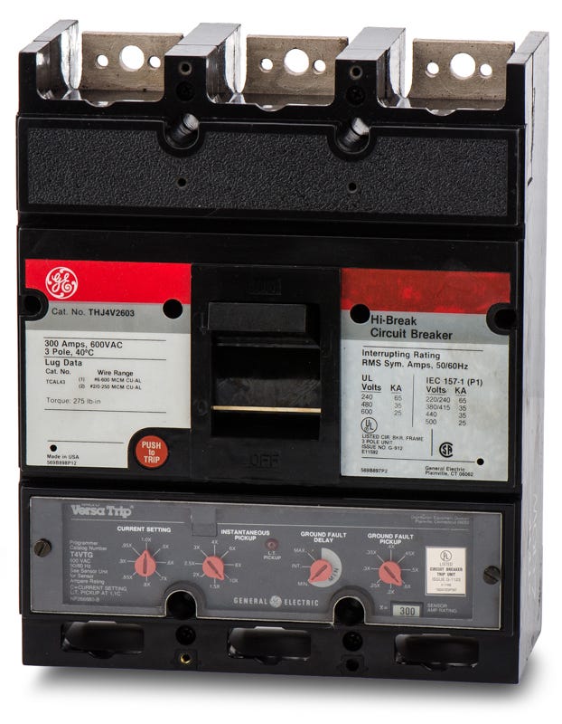 General Electric microversa trip THJ4V series three pole 600 ampere bolt-on molded case circuit breaker with maximum voltage rating of 600 volt protection solid state and standard interrupting rating of 35 kiloampere at 480V complete with Power+ 4 trip (LI) long-time and instantaneous trip functions.