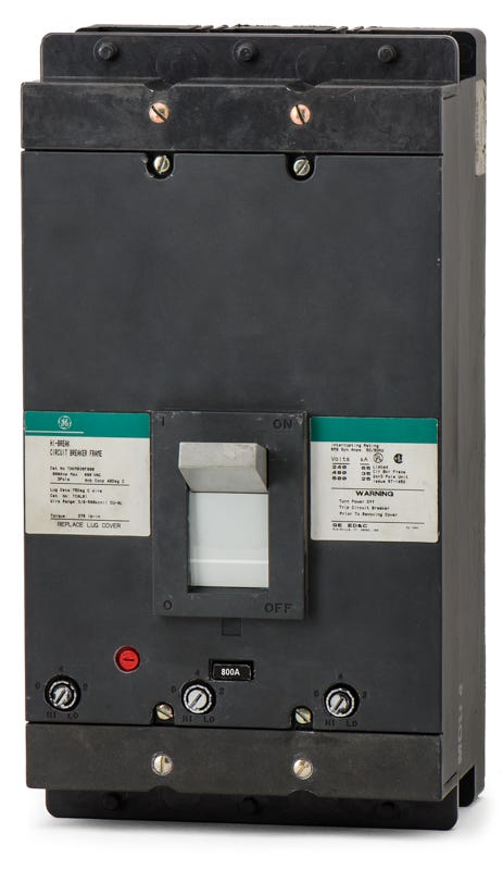 General Electric THKM series three pole 800 ampere bolt-on molded case circuit breaker with maximum voltage rating of 600V tripping method thermal magnetic and standard interrupting rating of 35 kiloampere at 480V complete with interchangeable trip unit and load side lug terminals.