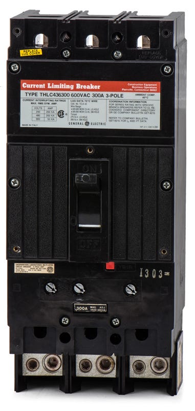 The General Electric THLC436300 is a 3 Pole thermal magnetic molded case circuit breaker with a current rating of 300 Amps and a voltage rating of 600V. It has an interrupting rating of 200kAIC at 480V. The THLC436300 has a bolt-on connection type and includes long time and instantaneous trip function.