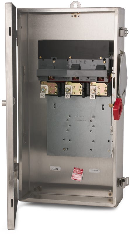General Electric three pole 100 ampere heavy duty stainless steel non-fusible disconnect and safety switch with maximum voltage rating of 600V and high interrupting rating of 200 kiloampere at 600V specially designed for commercial and industrial applications where safety high performance and continuity of service are essential.