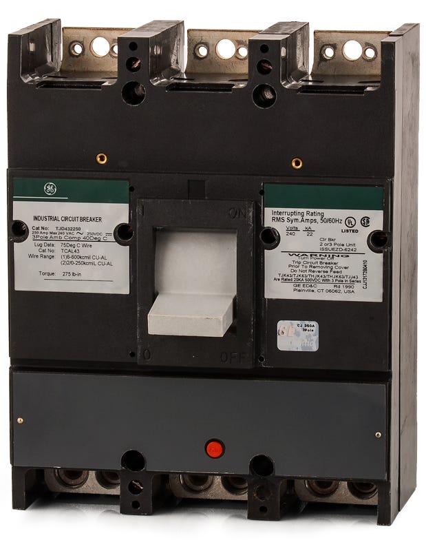 The General Electric TJD432250 is a 3 Pole thermal magnetic molded case circuit breaker with a current rating of 250 Amps and a voltage rating of 240V. It has an interrupting rating of 22kAIC at 240V. The TJD432250 has a bolt-on connection type and includes LI - Long-Time and instantaneous trip function.