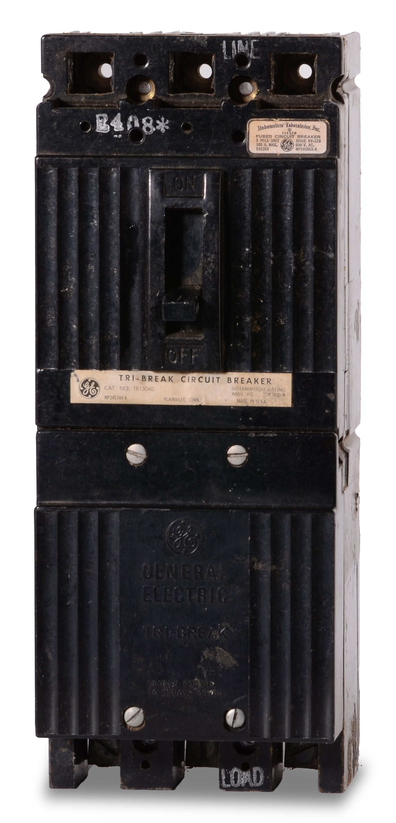 The General Electric TB13040 is a 3 Pole thermal magnetic molded case circuit breaker with a current rating of 40 Amps and a voltage rating of 600VAC. It has an interrupting rating of 200kAIC@480V. The TB13040 has a feed-thru connection type and includes long time and instantaneous trip functions.