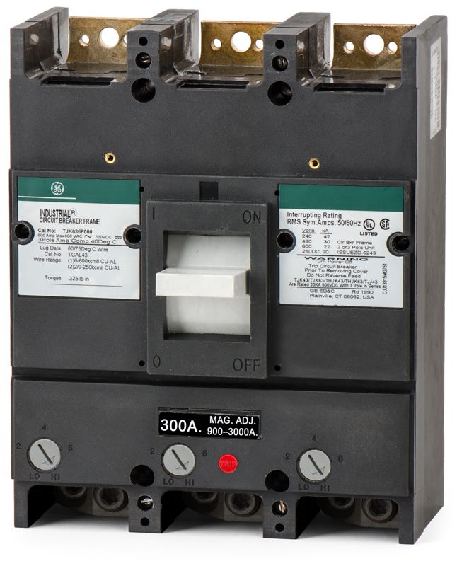 • Authentic General Electric Product • Molded Case Thermal Magnetic • UPC : 783164050738 • J Frame • 240/480/600 Vac 500 Vdc • 300 Ampere • 3 Pole • Interrupting Rating 42 Kiloampere At 240 Vac 30 Kiloampere At 480 Vac 22 Kiloampere At 600 Vac 20 Kiloampere At 500 Vdc • Terminal Aluminum/Copper Line Lug Load Lug • Size 8 1/4 Inch W X 3 13/16 Inch D X 10 1/8 Inch H • J600 Model