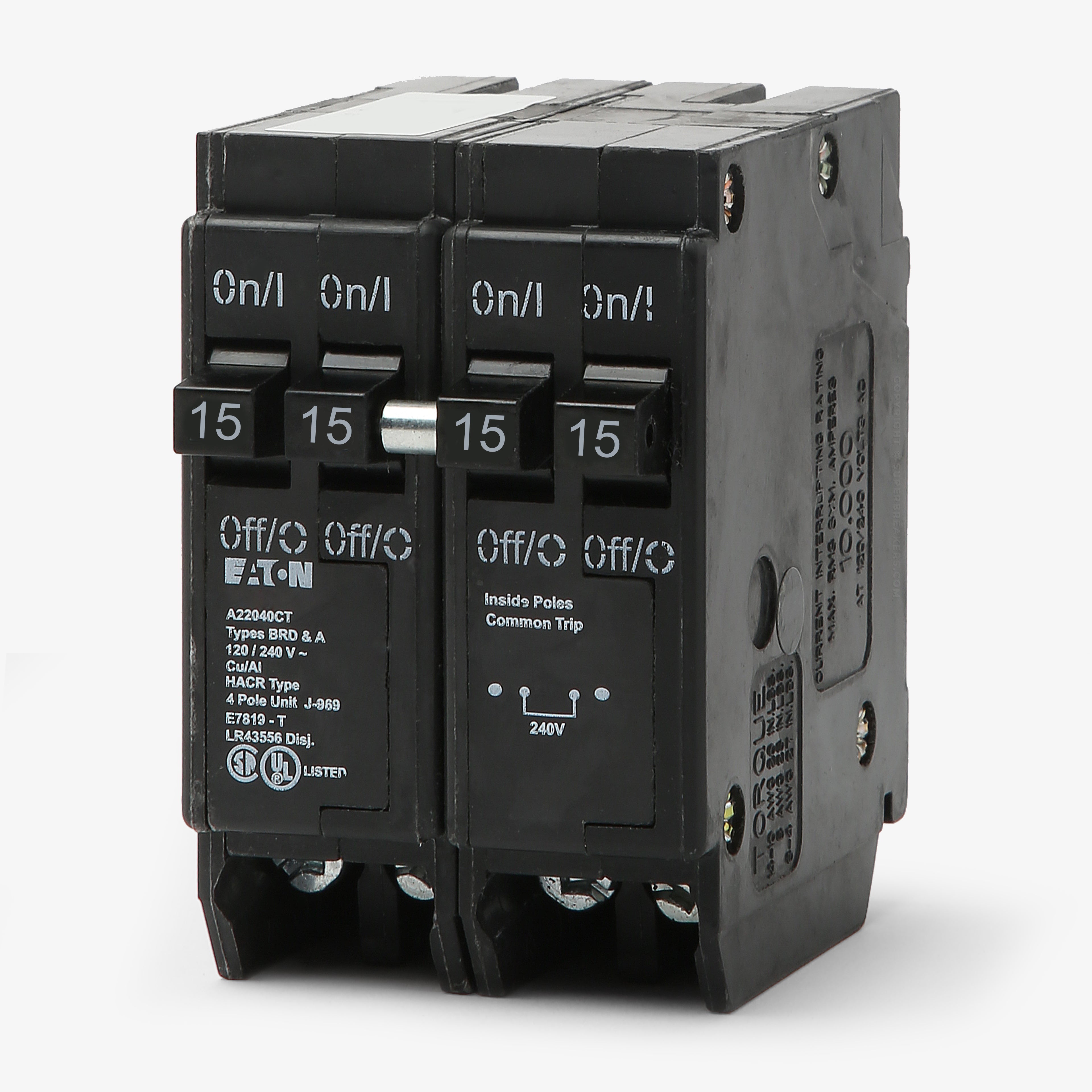 The Eaton BQC2152115 is a quad molded case circuit breaker with a current rating of (2) 1-Pole 15 Amps, (1) 2-Pole 15 Amps and a voltage rating of 120/240VAC. It has an interrupting rating of 10kAIC at 240V. The BQC2152115 has a plug-on mounting type and includes LI - long-time and instantaneous trip functions.