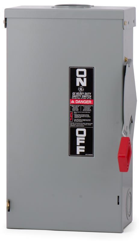 General Electric Spec-Setter THN series three pole 600 ampere single configuration disconnect and safety switch with maximum voltage rating of 600V and extra high interrupting rating of 200 kiloampere at 480V suitable for outdoor use.