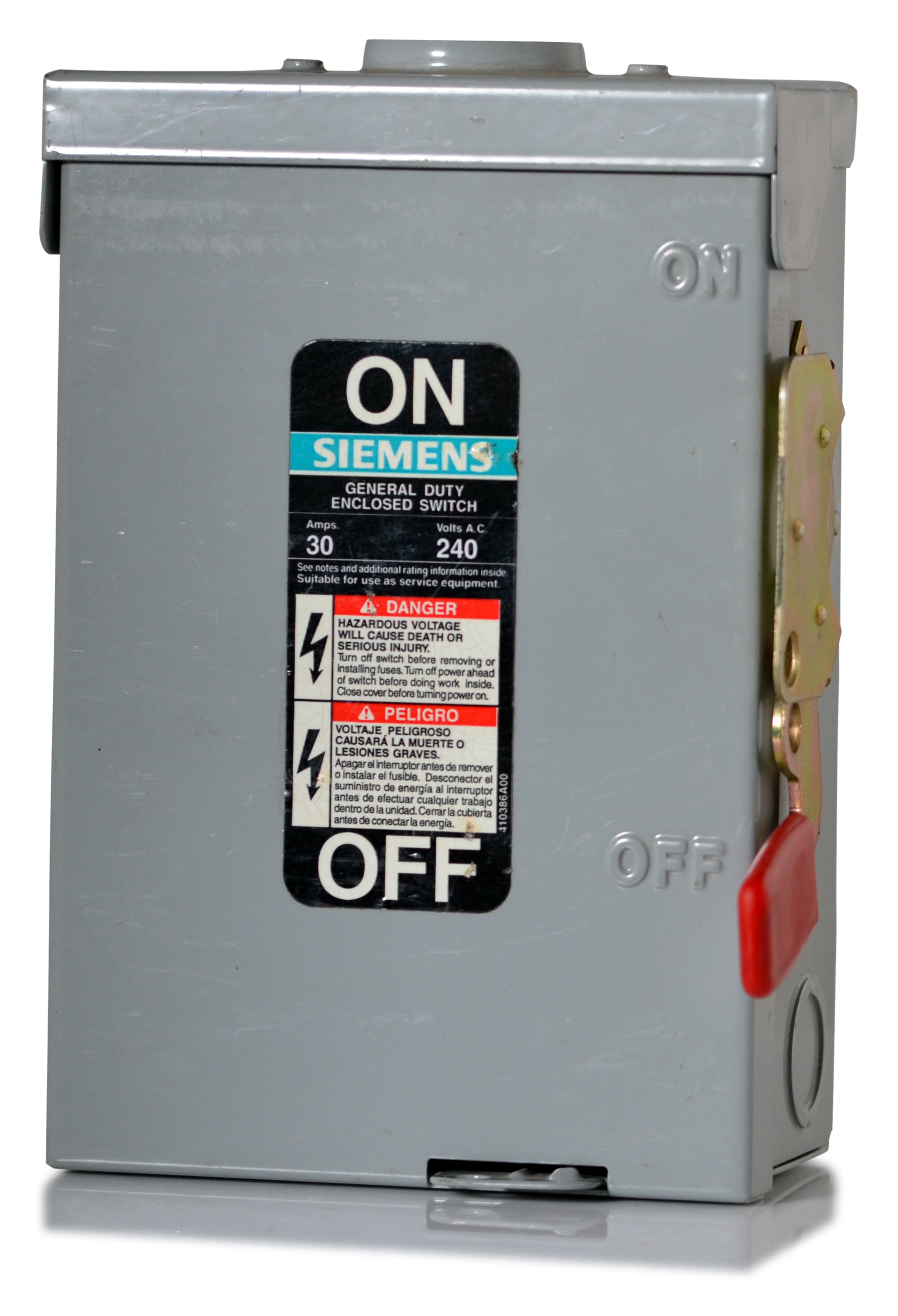 The Siemens GF221NR is a 2 Pole safety switch with current rating of 30 Amps and a voltage rating of 240VAC, 250VDC.