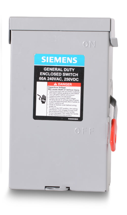 The Siemens GNF322A is a 3 Pole safety switch with a current rating of 60 Amps and a voltage rating of 240VAC. The GNF322A has a surface mounting type and it is used for indoor application.