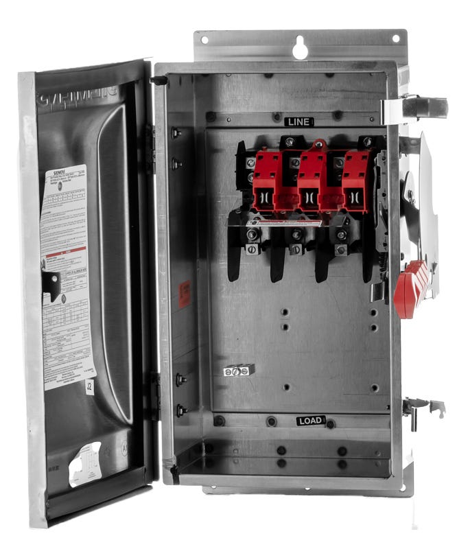 Siemens heavy duty safety switch features a heavy duty safety disconnect switches. The safety switch has a current rating of 60 amps with a voltage rating of 600 v.It has an interrupt rating of 200kA@600V.