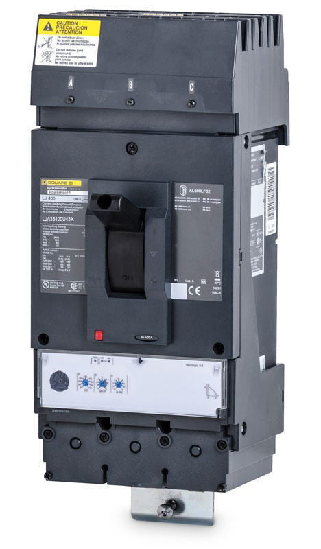 The Schneider Electric LJA36400U43X is a 3 Pole solid state molded case circuit breaker with a current rating of 400 Amps and a voltage rating of 600VAC. It has an interrupting rating of 100kAIC at 240VAC, 65kAIC at 480V, 25kAIC at 600VAC. The LJA36400U43X has a I-Line bracket mounting type and includes LSI - long-time, short-time and instantaneous functions.