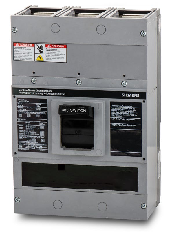 The Siemens JXD63S400A is a 3 Pole non-automatic molded case circuit breaker with a current rating of 400 Amps and a voltage rating of 600VAC. It has an interrupting rating of 35kAIC at 480V. The JXD63S400A has a bolt-on connection type and includes no overcurrent protection functions.