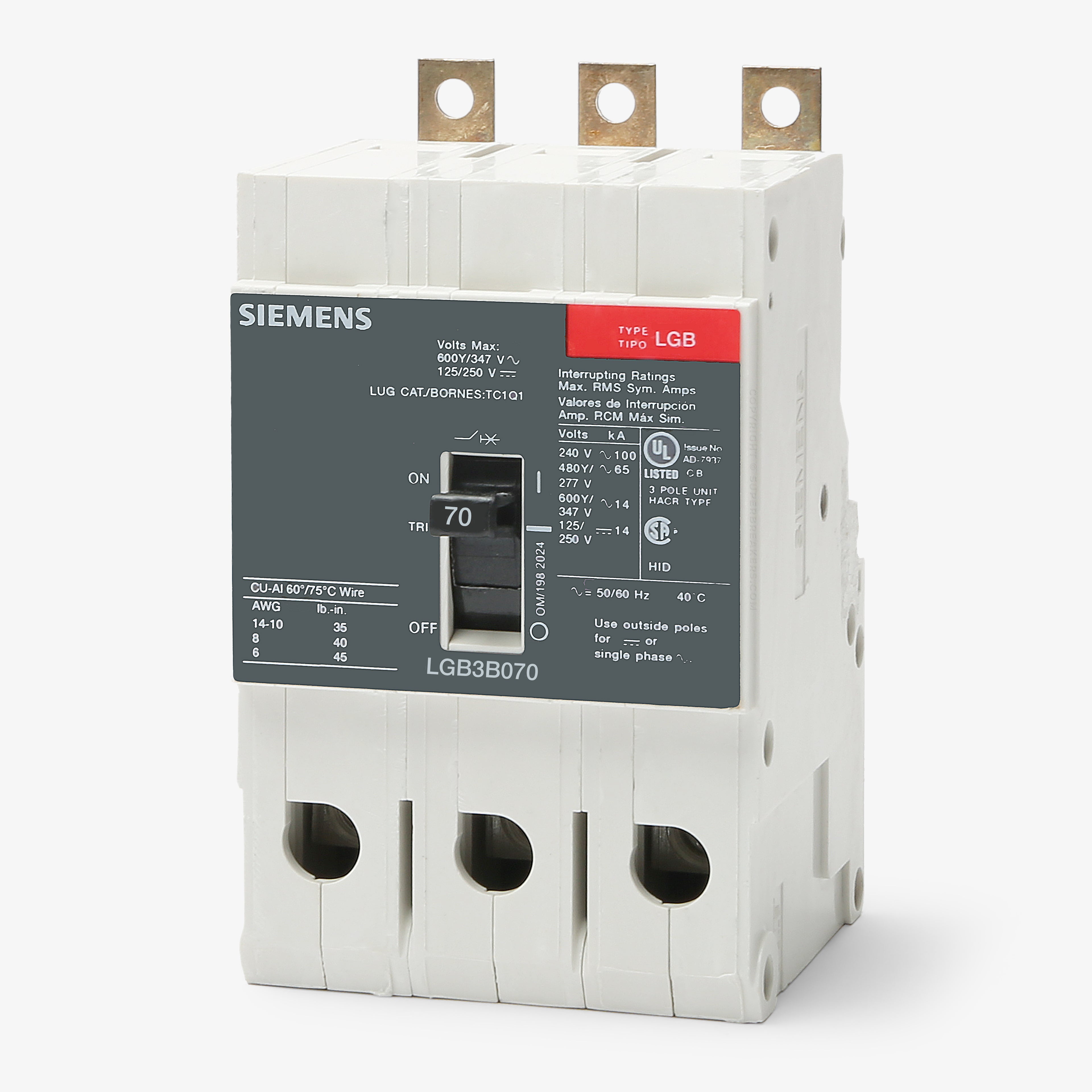 The Siemens LGB3B070B is a 3 Pole thermal magnetic molded case circuit breaker with a current rating of 70 Amps and a voltage rating of 600V. It has an interrupting rating of 100kAIC at 240V. The LGB3B070B has a bolt-on connection type and includes long time and instantaneous trip functions.