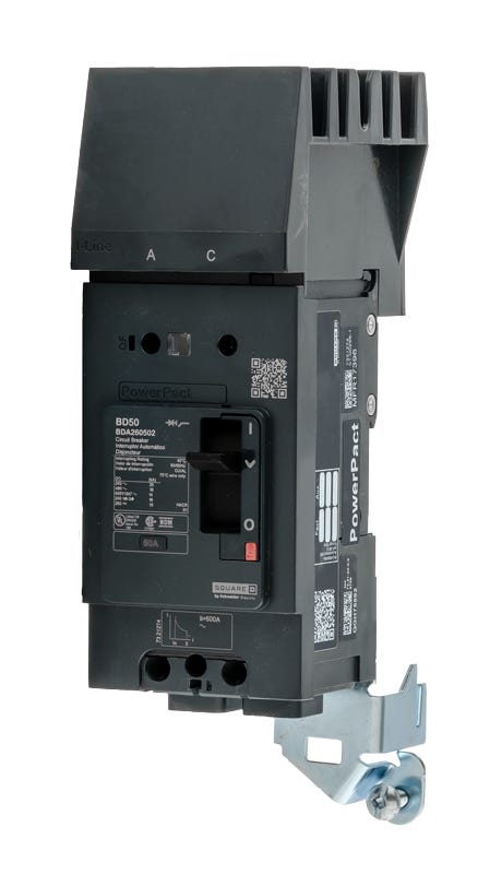 The Square D BDA260502 is a 2 Pole thermal magnetic molded case circuit breaker with a current rating of 50 Amps and a voltage rating of 600Y/347VAC. It has an interrupting rating of 18kAIC@480V. The BDA260502 has a I-Line style plug-in connection type and includes long time and instantaneous trip functions.
