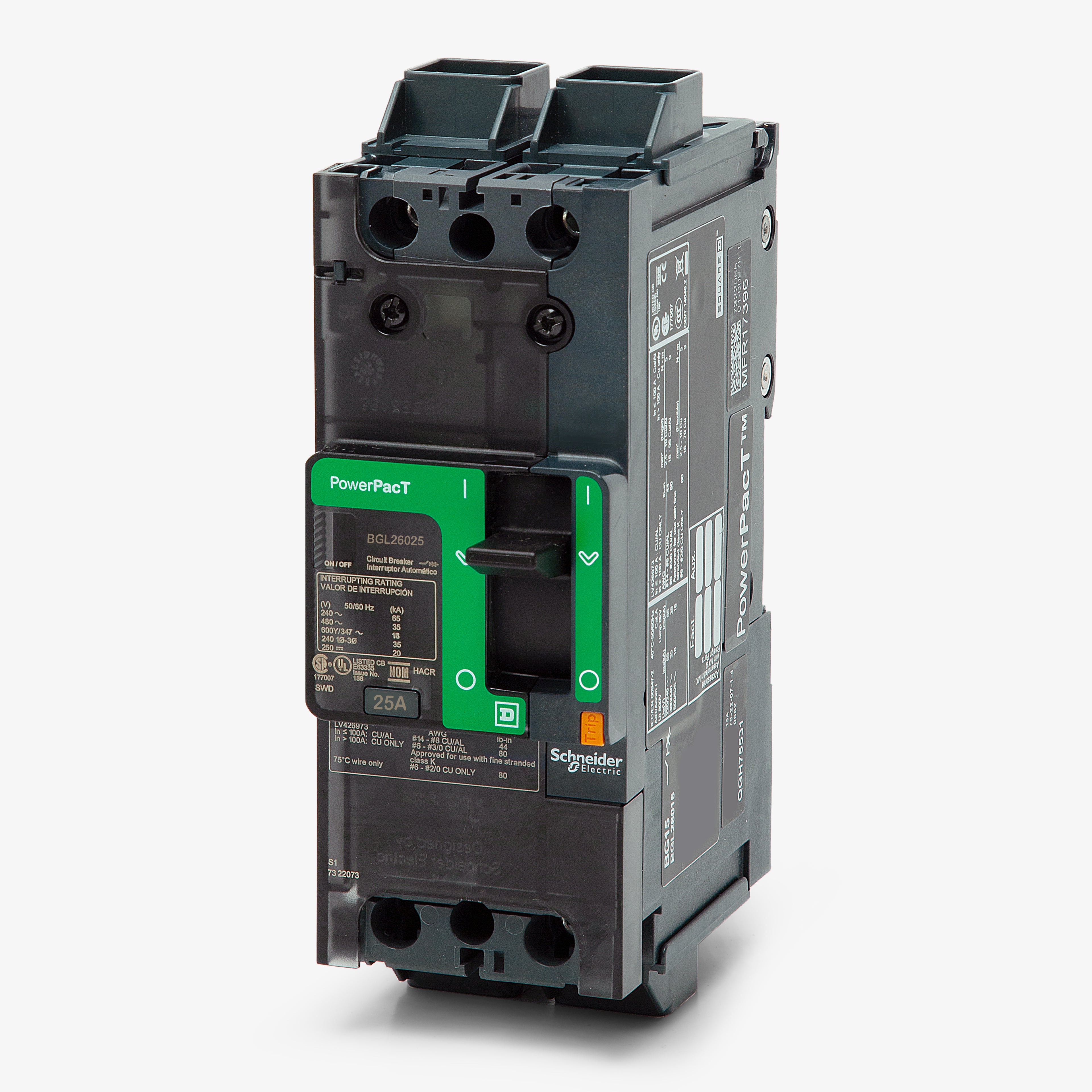 The Square D BGL26025 is a 2 Pole thermal magnetic molded case circuit breaker with a current rating of 25 Amps and a voltage rating of 600Y/347VAC. It has an interrupting rating of 100kA at 240VAC. The BGL26025 has a unit mounting type and includes long time and instantaneous trip functions.