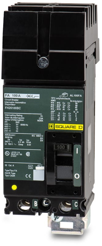 The Square D FH26100BC is a 2 Pole thermal magnetic molded case circuit breaker with a current rating of 100 Amps and a voltage rating of 600V. It has an interrupting rating of 25kA@480V. The FH26100BC has a I-Line style plug-in connection type and includes LI - long time and instantaneous functions.