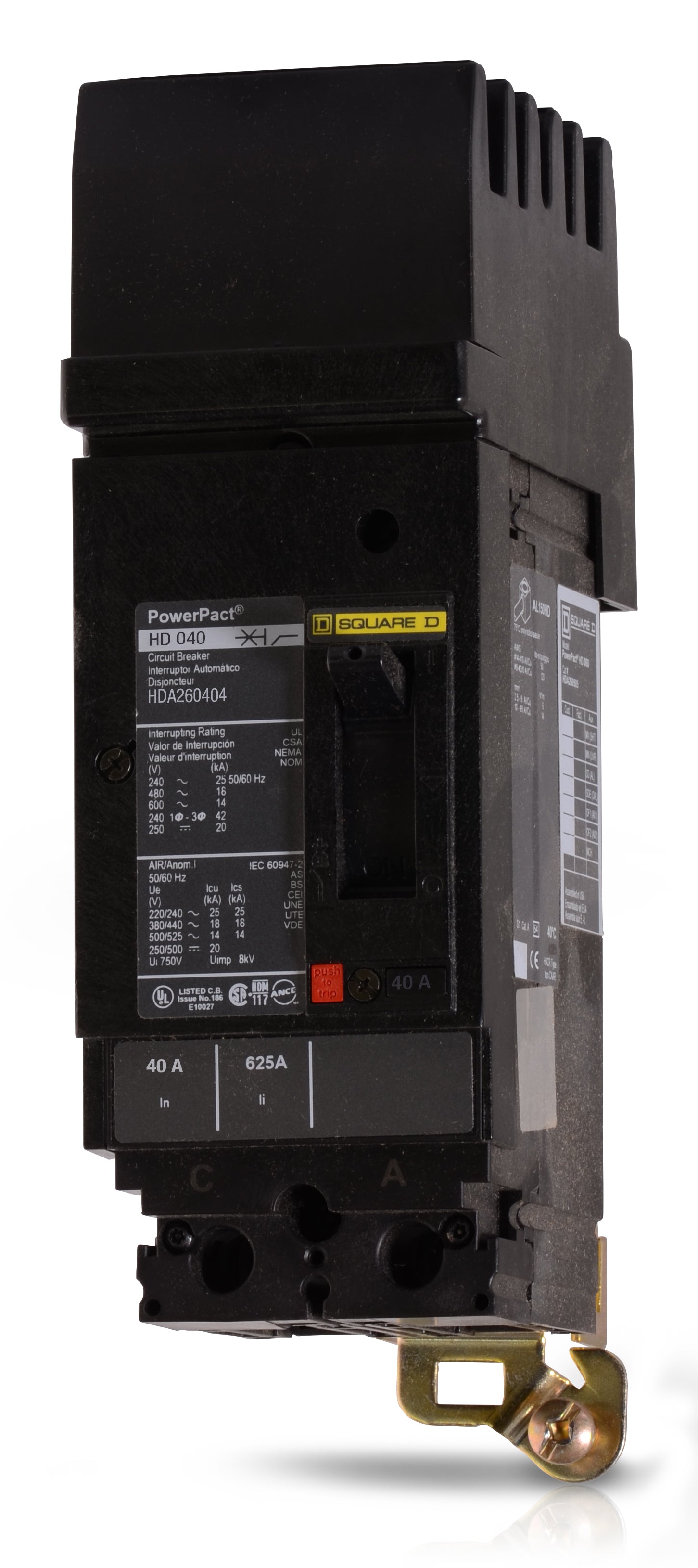 The Square D HDA260404 is a 2 Pole thermal magnetic molded case circuit breaker with a current rating of 40 Amps and a voltage rating of 600V. It has an interrupting rating of 25kAIC at 240VAC, 18kAIC at 480VAC. The HDA260404 has an I-Line style plug-in connection type and includes long time and instantaneous trip functions.