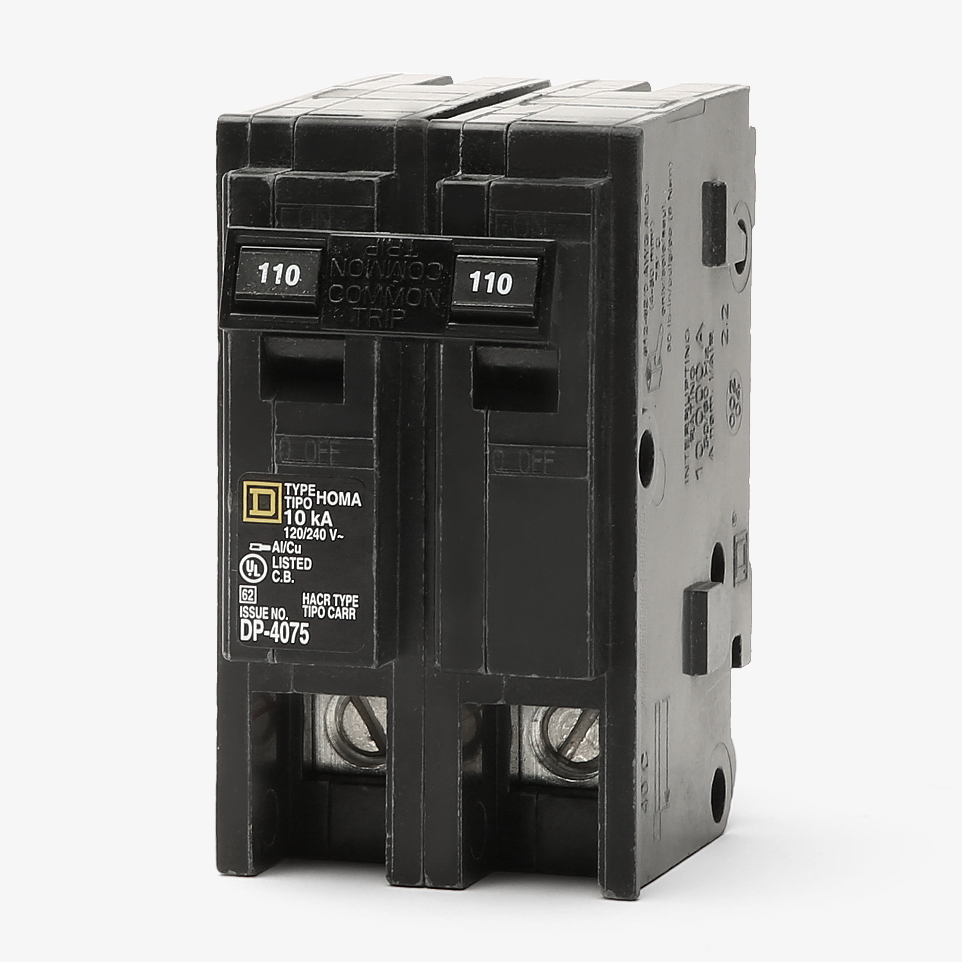 The Square D HOM2110 is a 2 Pole thermal magnetic molded case circuit breaker with a current rating of 110 Amps and a voltage rating of 240V. It has an interrupting rating of 10kAIC at 120/240VAC. The HOM2110 has a plug-in mounting type and includes long time and instantaneous trip functions.