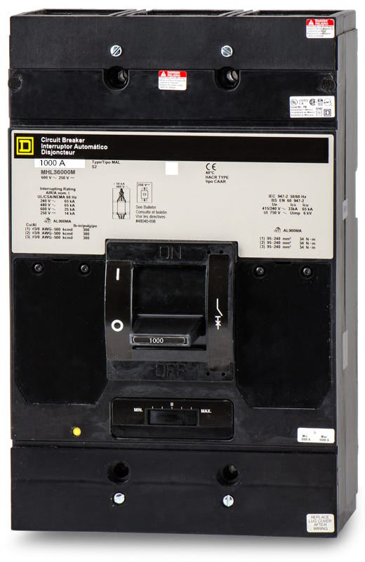 The Square D MHL36000M is a 3 Pole magnetic molded case circuit breaker with a current rating of 1000 Amps and a voltage rating of 600V. It has an interrupting rating of 65kAIC at 480V. The MHL36000M has a feed-thru connection type and includes instantaneous trip functions.