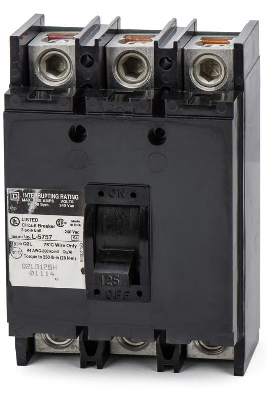 The Square D Q2L3125H is a 3 Pole thermal magnetic molded case circuit breaker with a current rating of 125 Amps and a voltage rating of 240V. It has an interrupting rating of 22kAIC at 240V.The Q2L3125H has a feed-thru connection type and includes long time and instantaneous trip functions.