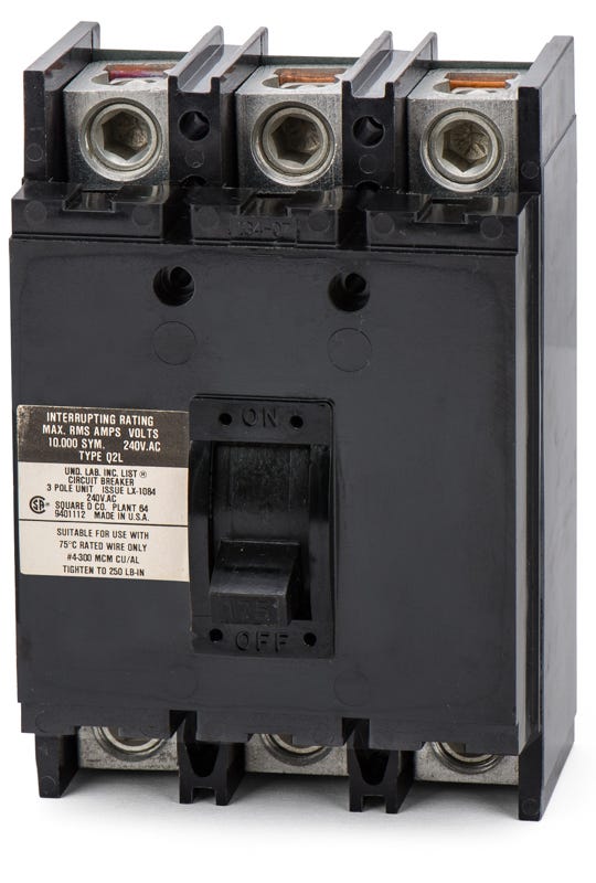 The Square D Q2L3175 is a 3 Pole thermal magnetic molded case circuit breaker with a current rating of 175 Amps and a voltage rating of 240V. It has an interrupting rating of 10kA@240V. The Q2L3175 has a feed-thru connection type and includes LI - long time and instantaneous functions.