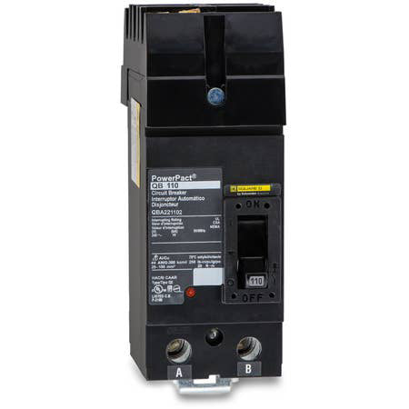 The Square D QBA221102 is a 2 Pole thermal magnetic molded case circuit breaker with a current rating of 110 Amps and a voltage rating of 240VAC. It has an interrupting rating of 10kAIC@240V. The QBA221102 has a I-Line style plug-in connection type and includes long time and instantaneous trip functions.