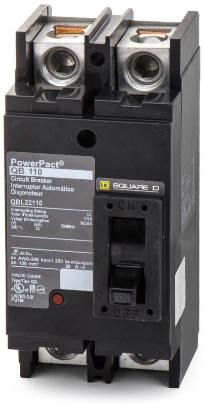 The Square D QBL22110 is a 2 Pole thermal magnetic molded case circuit breaker with a current rating of 110 Amps and a voltage rating of 240V. It has an interrupting rating of 10kAIC at 240V. The QBL22110 has a feed-thru connection type and includes long time and instantaneous trip functions.