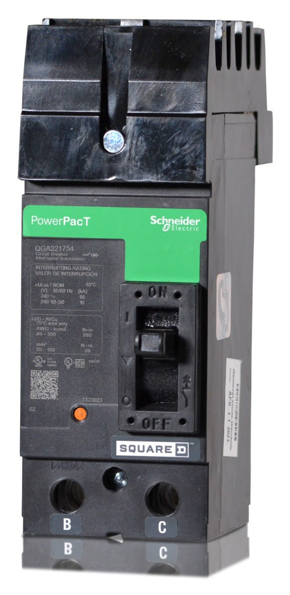 The Square D QGA221754 is a 2 Pole thermal magnetic molded case circuit breaker with a current rating of 175 Amps and a voltage rating of 240VAC. It has an interrupting rating of 65kAIC at 240VAC. The QGA221754 has a I-line bracket mounting type and includes long time and instantaneous trip functions.