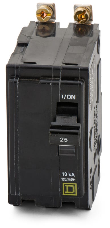 The Square D QOB225VH is a 2 Pole thermal magnetic molded case circuit breaker with a current rating of 25 Amps and a voltage rating of 120/240VAC. It has an interrupting rating of 22kAIC at 120/240VAC. The QOB225VH has a bolt-on connection type and includes LI - long-time and instantaneous trip functions.
