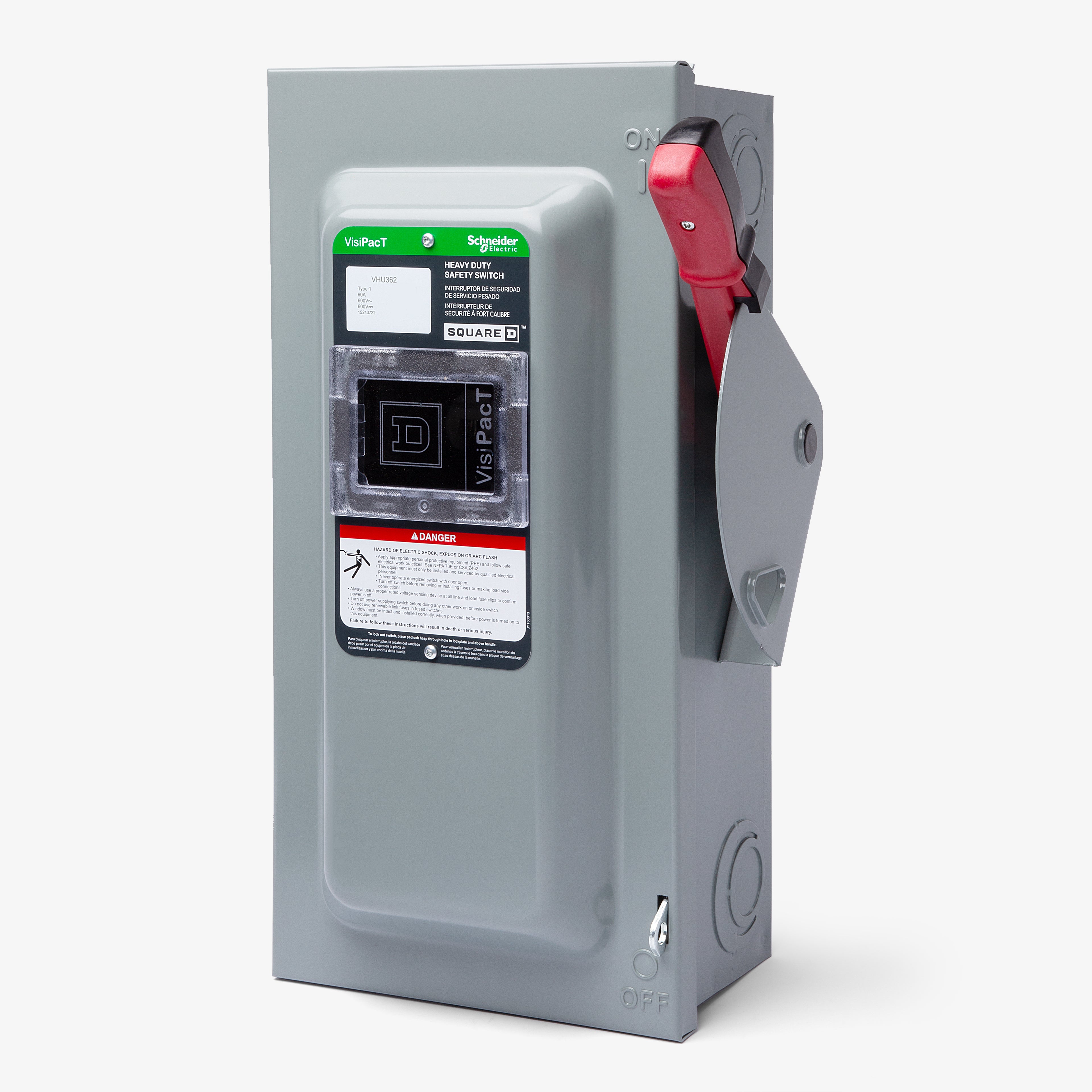 The Square D VHU362 is a 3 Pole safety switch with a current rating of 60 Amps and a voltage rating of 600VAC/VDC. It includes dual cover interlock. The VHU362 has a surface mounting type and it is used for service entrance, heavy and indoor applications.